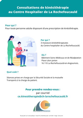 Les consultations externes de kinésithérapie du Centre Hospitalier de La Rochefoucauld, ouvertes depuis le 1er avril 2025, offrent aux patients un accompagnement spécialisé grâce à une équipe de kinésithérapeutes expérimentés, intervenant dans divers domaines tels que les troubles musculosquelettiques, la traumatologie, la prise en charge des sportifs ou encore la neurologie.